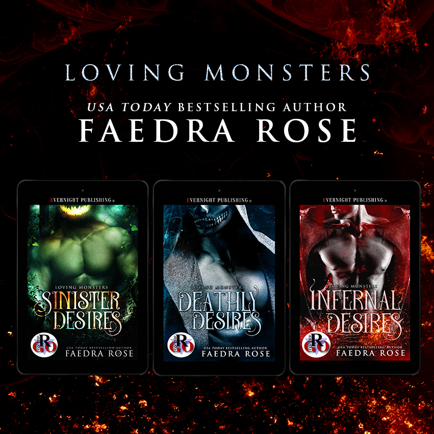 Loving Monsters is a series of short, extremely dark and spicy modern day monster romances based in the United States of America, and features a different monster paramour in each title looking to find his Happily Ever After with a human woman on Halloween! Each book stands alone, but the lore of the series is a thread that weaves through out. Be sure to check out the first two books in the series: Sinister Desires and Deathly Desires!