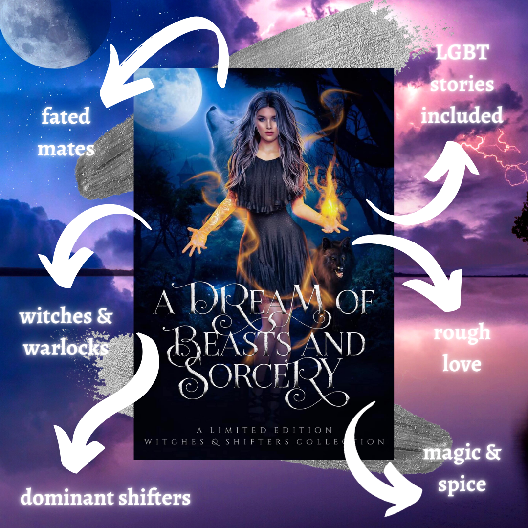 A DREAM OF BEASTS AND SORCERY features my story Magic & Moonlight. It’s about a lone wolf shifter and a magicless warlock!