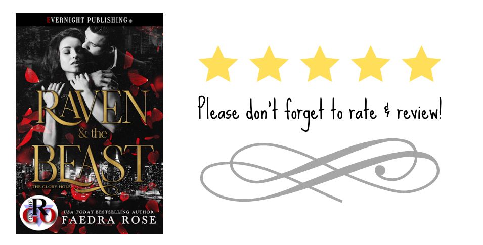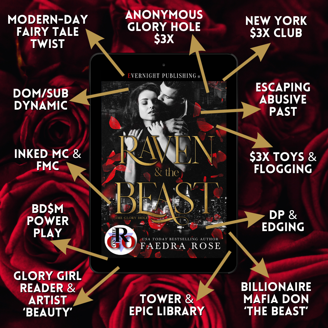 BLURB: Escaping an abusive relationship with a violent Dom, Cassidy has nothing and no one to support her. So, she does the only thing she can. She takes on the oldest trade in the world, and sells her body by the hour at The Glory Hole, the oldest, and most famous sex club in New York City. Taking on the stage name of “Raven”, she intends to work just as long as it takes to save some money, and get back on her own two feet. But then she meets her first anonymous patron for the night—“the Beast”—and her life takes a very unexpected turn when he doesn’t want to let her go.