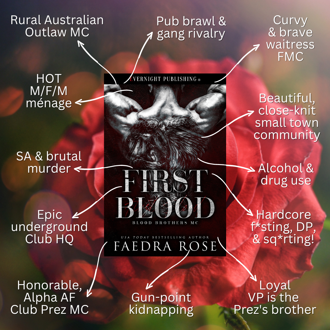 A new month has rolled over, and I have exceedingly EPIC news! I’ve begun my foray into Dark Contemporary Romance, and popped my cherry with a BRAND NEW seriously gritty, dark, and spicy series. And I have to say, this book is an absolute love song to my country, Australia, and our bogan, outlaw MC culture! So, without further ado, let me introduce to you… book one of the Blood Brother’s MC series, First Blood!