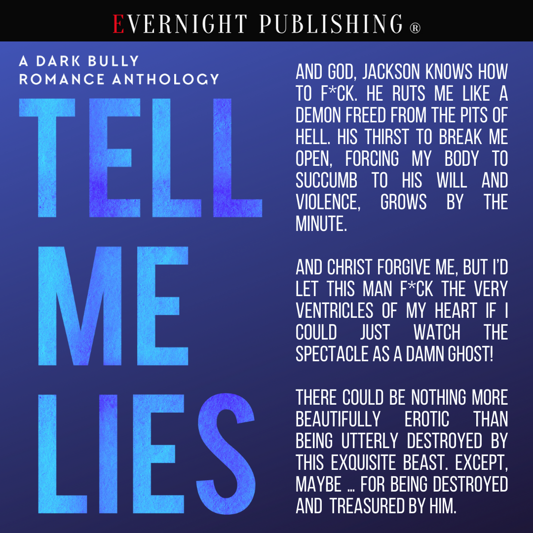 If you believe in live and let live, and love is love, then this beautiful anthology of dark bully romance from Evernight Publishing is for YOU! TELL ME LIES: MANLOVE EDITION is an exclusive publication featuring just four talented authors, and I can’t even tell you how proud I am to be the headliner! My novella “Red Light Rivals” is one of my all time favourites I’ve ever written and I hope you’ll love it too! So, don’t wait. Grab your copy of this New Release while it’s HOT!